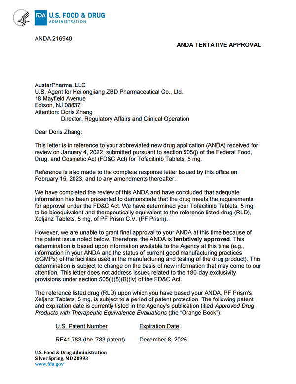 5月26日,珍寶島藥業(yè)發(fā)布公告,公司收到美國食品藥品監督管理局(簡(jiǎn)稱(chēng)“美國FDA”)的通知,珍寶島藥業(yè)向美國FDA申報的枸櫞酸托法替布片的新藥簡(jiǎn)略申請(ANDA,即美國仿制藥申請)已獲得暫時(shí)批準(暫時(shí)批準:指FDA已經(jīng)完成仿制藥的所有審評要求,但由于專(zhuān)利權或專(zhuān)賣(mài)權未到期而給予的一種批準形式)。