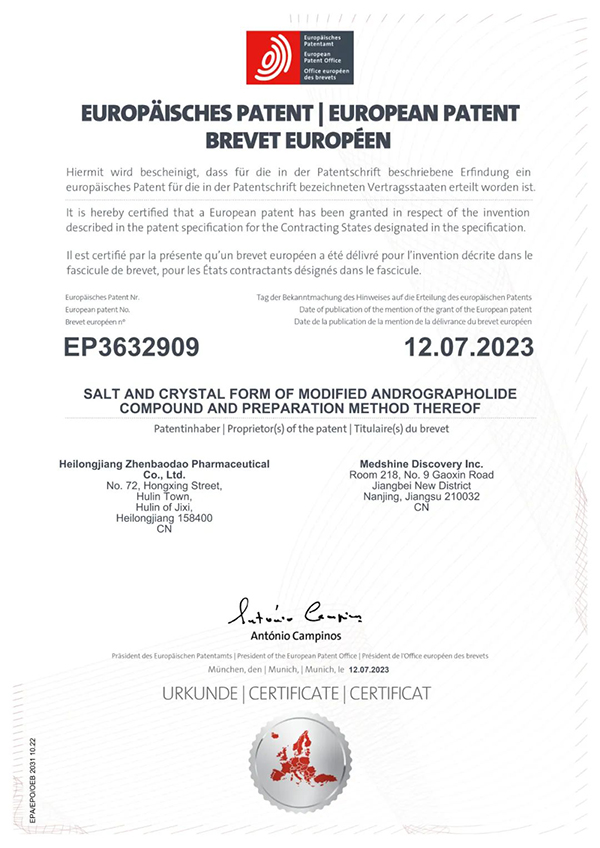 8月15日,珍寶島藥業(yè)發(fā)布公告。公司收到歐洲專(zhuān)利局頒發(fā)的內容為《一種穿心蓮內酯改構化合物的鹽型、晶型及其制備方法》的專(zhuān)利授權證書(shū)。其國際專(zhuān)利申請號為PCT/CN2018/088168,專(zhuān)利權期限為申請之日起20年。