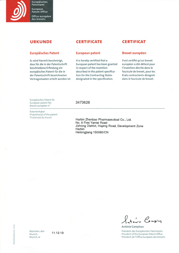 據珍寶島今日公告,黑龍江珍寶島藥業(yè)股份有限公司(以下簡(jiǎn)稱(chēng)“珍寶島”)子公司哈爾濱珍寶制藥有限公司(以下簡(jiǎn)稱(chēng)“哈珍寶”)收到美國專(zhuān)利局和歐洲專(zhuān)利局分別頒發(fā)的《專(zhuān)利授權證書(shū)》。