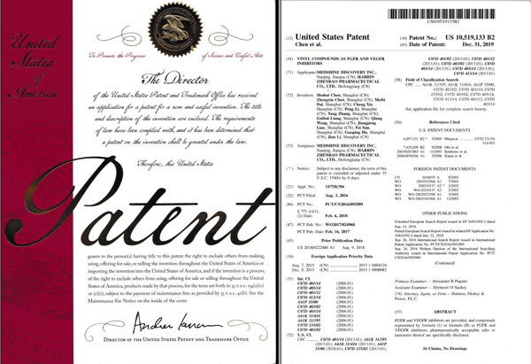 哈珍寶獲得的專(zhuān)利分別為:在歐洲獲得作為AKT抑制劑的二氫吡唑氮雜卓類(lèi)化合物專(zhuān)利;在美國獲得作為FGFR和VEGFR抑制劑的乙烯基化合物專(zhuān)利。