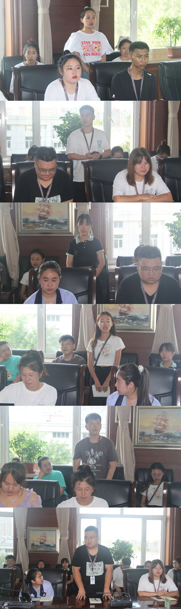 會(huì )議首先傳達了方同華董事長(cháng)和陳??偛迷诖髮W(xué)生座談會(huì )上的講話(huà)文件,大學(xué)生們認真聆聽(tīng)、記錄,領(lǐng)會(huì )精神。隨后,上一屆入職公司的大學(xué)生鐘方卓、王笑穎,作為老學(xué)員代表進(jìn)行了發(fā)言。她們暢談了這一年來(lái)在公司的經(jīng)歷和體會(huì ),感受最深的就是公司的和諧、友愛(ài)、務(wù)實(shí)、奮進(jìn);她們鼓勵新學(xué)員敞開(kāi)心扉,擺正姿態(tài),潛心鉆研業(yè)務(wù),努力提升自我。大學(xué)生們依次作了自我介紹,并將自己今后的職業(yè)發(fā)展方向和規劃與公司領(lǐng)導進(jìn)行了交流,各系統、部門(mén)、車(chē)間負責人也對大學(xué)生們提出了希望和要求。