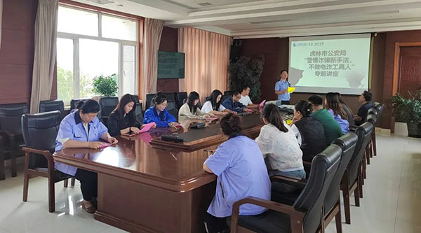 7月10日下午,虎林市公安局曙光派出所民警深入珍寶島藥業(yè)(虎林),開(kāi)展電信網(wǎng)絡(luò )反詐騙宣講活動(dòng),公司人事行政總監蘭培寶組織各部門(mén)員工第一時(shí)間到場(chǎng)聆聽(tīng)宣講。