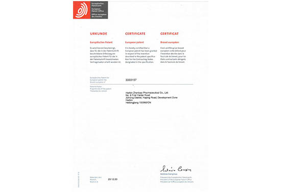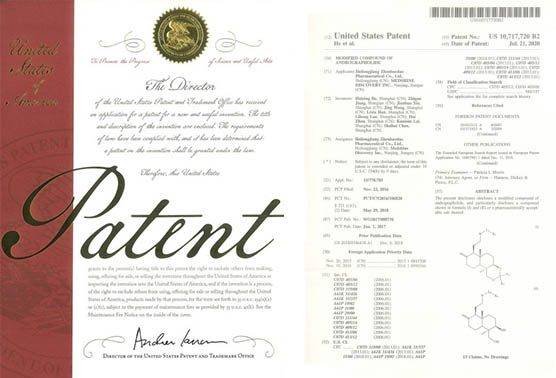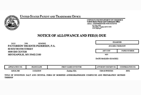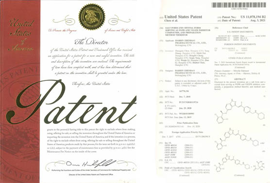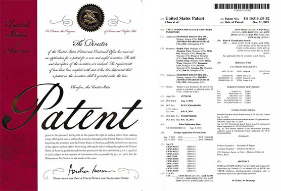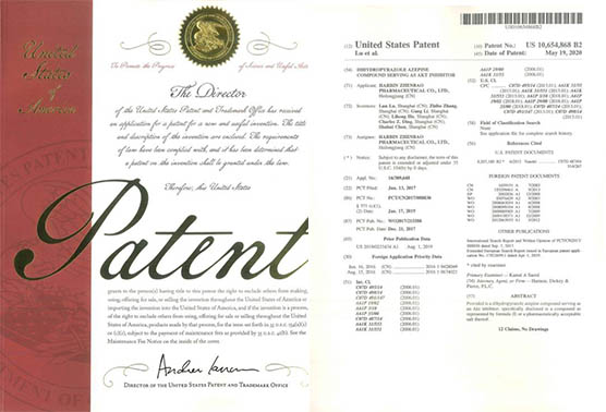 國內發(fā)明專(zhuān)利兩個(gè)在研創(chuàng )新藥的PCT專(zhuān)利申請在中國及歐洲同步審查中,《作為FGFR和VEGFR抑制劑的乙烯基化合物》已獲得美國、歐洲、日本授權;《作為Akt抑制劑的二氫吡唑氮雜卓類(lèi)化合物》已獲得美國、歐洲、日本、韓國授權;《作為Akt抑制劑的鹽型及其晶型》已獲得美國、日本、韓國和歐盟授權;《穿心蓮內酯改構化合物》獲得美國授權;《一種穿心蓮內酯改構化合物的鹽型、晶型及其制備方法》獲得美國、歐洲授權;《一種作為FGFR和VEGFR抑制劑化合物的鹽型、晶型及其制備方法》獲得美國和日本授權。